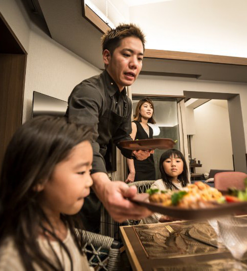 お食事はあえて提供せず、お客様ご自身が望む自由な滞在を楽しんで頂ける設備をご用意。キッチン、家電、冷蔵庫はもちろん、180㎝四方の大きくて贅沢なダイニングテーブルを備えました。