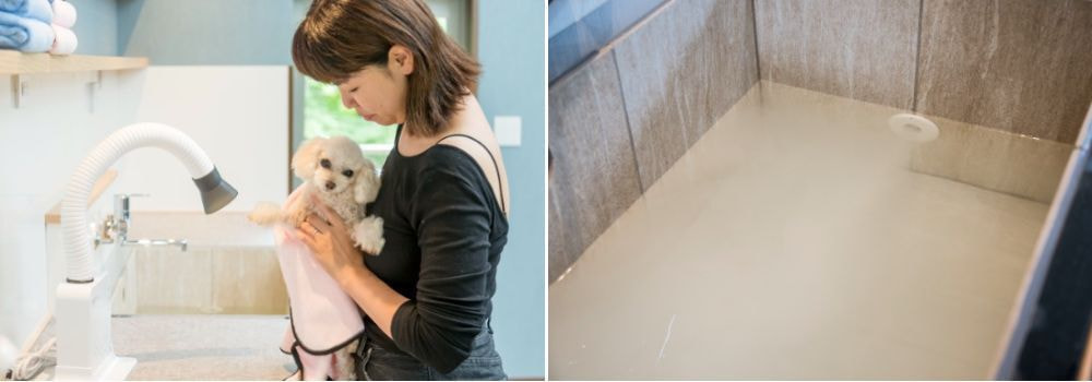 2階に常設された「Yuni-Oneサロン」にはマイクロバブルバス&シャワーシンクを完備。いつでもお好みの温度で、わんちゃんを洗ってリフレッシュできます。